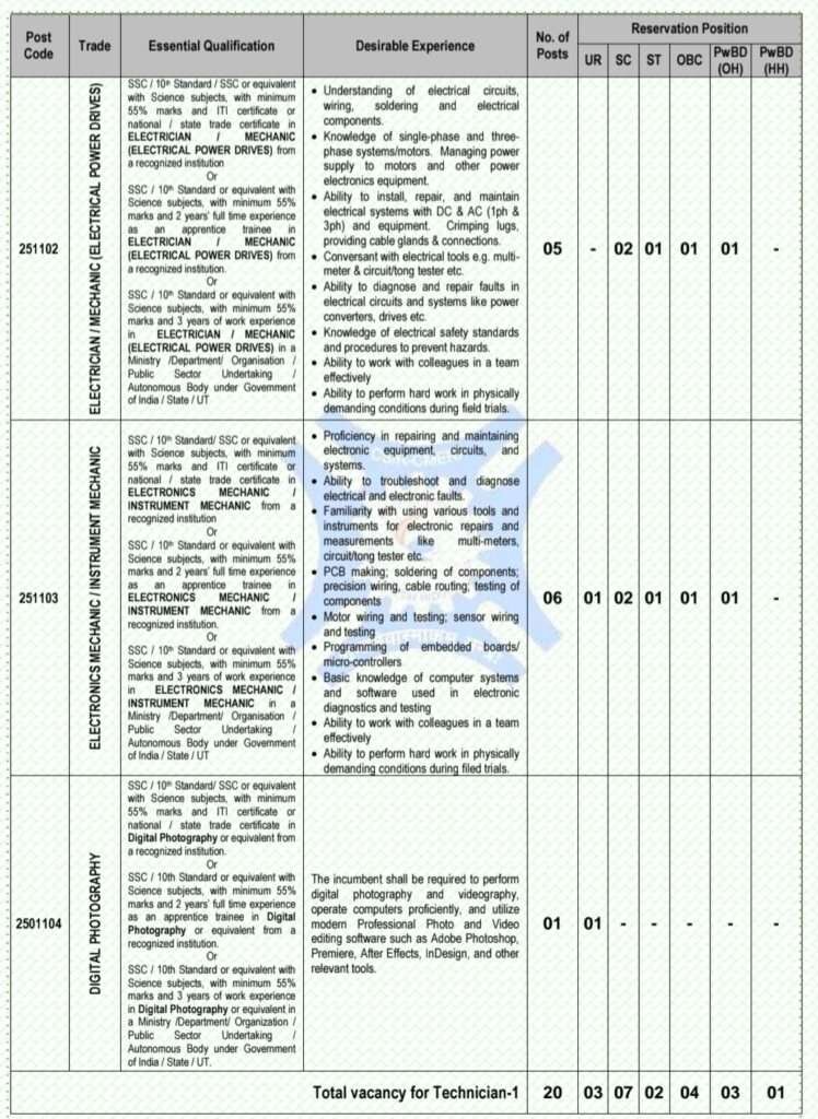 టెక్నీషియన్ (డిజిటల్ ఫోటోగ్రఫీ) :: కనీసం 55% మార్కులతో సైన్స్ సబ్జెక్టులతో SSC/10 స్టాండర్డ్/ SSC లేదా తత్సమాన పరీక్ష మరియు గుర్తింపు పొందిన సంస్థ నుండి I సర్టిఫికేట్ నేషనల్ స్టేట్ ట్రేడ్ సర్టిఫికేట్ డిజిటల్ ఫోటోగ్రఫీ లేదా తత్సమాన పరీక్ష. లేదా కనీసం 55% మార్కులతో సైన్స్ సబ్జెక్టులతో SSC/10వ తరగతి లేదా తత్సమాన పరీక్ష మరియు గుర్తింపు పొందిన సంస్థ నుండి డిజిటల్ ఫోటోగ్రఫీకి సమానమైన విభాగంలో అప్రెంటిస్ ట్రైనీగా 2 సంవత్సరాల పూర్తి సమయం అనుభవం ఉండాలి. లేదా SSC/10వ తరగతి లేదా తత్సమాన డిగ్రీ, కనీసం 50% మార్కులతో సైన్స్ సబ్జెక్టులతో మరియు డిజిటల్ ఫోటోగ్రఫీలో 3 సంవత్సరాల పని అనుభవం లేదా భారత/రాష్ట్ర/UT ప్రభుత్వం కింద ప్రభుత్వ రంగ సంస్థను చేపట్టే స్వయంప్రతిపత్తి సంస్థలో మంత్రిత్వ శాఖ విభాగ సంస్థలో తత్సమాన అనుభవం.