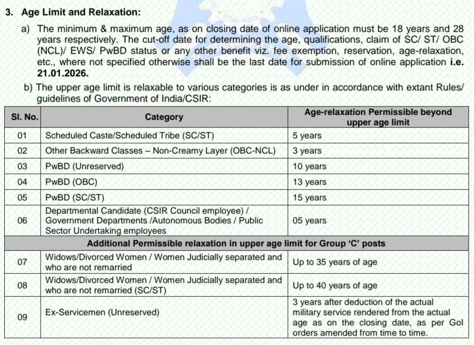 »వయోపరిమితి:  21.01.2026 నాటికి  28 సంవత్సరాలు గరిష్ట వయోపరిమితి, SC/ST విద్యార్థులకు 5 సం||రాలు & OBC అభ్యర్థులకు కు 3 సం||రాలు వయసు సడలింపు ఉంటుంది.