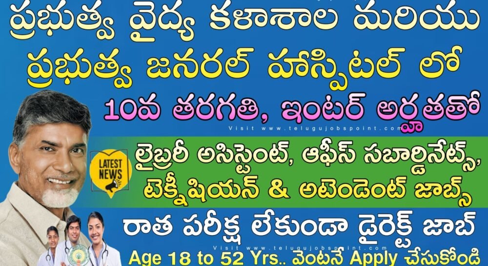 ఆంధ్రప్రదేశ్ ప్రభుత్వం వైద్య, ఆరోగ్య మరియు కుటుంబ సంక్షేమ శాఖ (HM & FW Department) డైరెక్టర్ ఆఫ్ మెడికల్ ఎడ్యుకేషన్ (DME) ద్వారా ప్రభుత్వ వైద్య కళాశాల మరియు ప్రభుత్వ జనరల్ హాస్పిటల్, రాజమహేంద్రవరం వారి పరిధిలో గల ఆఫీస్ సబార్డినేట్స్, అనేస్తేషియా టెక్నీషియన్, కార్డియాలజీ టెక్నీషియన్, ల్యాబ్ టెక్నీషియన్, ఆపరేషన్ థియేటర్ టెక్నీషియన్, జనరల్ డ్యూటీ అటెండంట్స్, స్టోర్ అటెండెంట్, ల్యాబ్ అటెండెంట్, ఈసీజీ టెక్నీషియన్ & లైబ్రరీ అసిస్టెంట్ పోస్టులకు ఉమ్మడి తూర్పు గోదావరి జిల్లా కు చెందిన అభ్యర్థుల Dt:22.12.2025 మరియు దరఖాస్తు వివరములు తూర్పు గోదావరి జిల్లా వెబ్ సైట్ https://eastgodavari.ap.gov.in https://gmcrajamahendravaram.ap.gov.in/about.aspx పరచడమైనది. అర్హులైన అభ్యర్థులు ఆఫ్ లైన్ లో వెంటనే అప్లై చేసుకోండి.