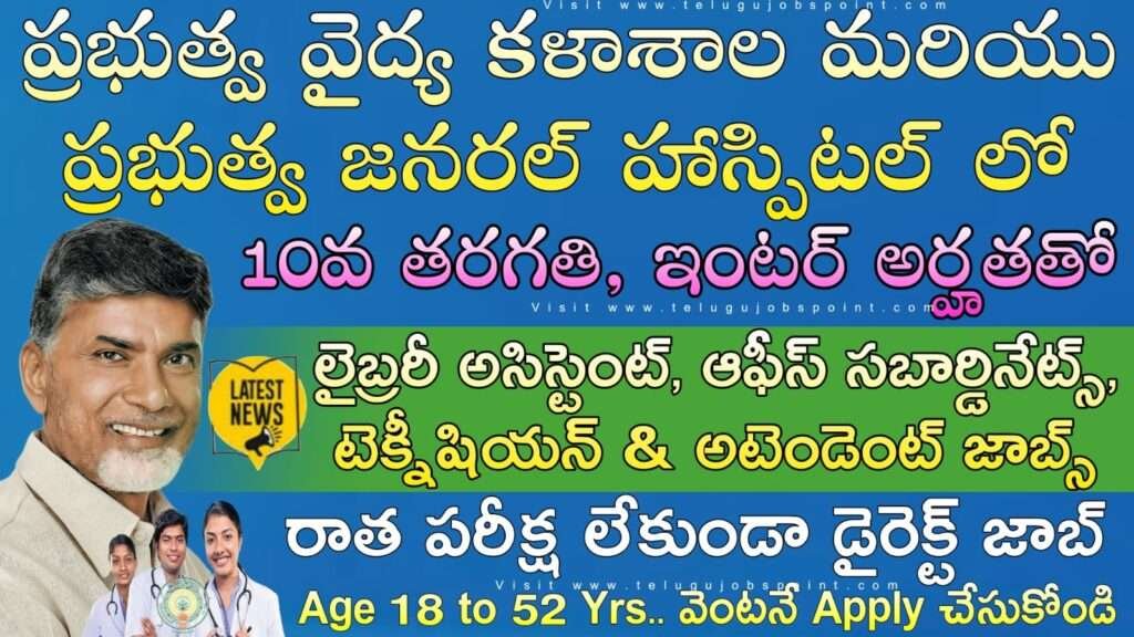 AP GMC and GGH Recruitment 2025 Latest Library Assistant, Lab Attendant & Office Subordinate Job Notification 2025 Apply Now : నిరుద్యోగులకు భారీ శుభవార్త.. కేవలం టెన్త్ ఆపై చదివిన అభ్యర్థులకు బంపర్ నోటిఫికేషన్.. సొంత జిల్లాలో ఉద్యోగం పొందే అవకాశం రావడం జరిగింది. ప్రభుత్వ వైద్య కళాశాల మరియు ప్రభుత్వ జనరల్ హాస్పిటల్, రాజమహేంద్రవరం వారి పరిధిలో గల ఆఫీస్ సబార్డినేట్స్, అనేస్తేషియా టెక్నీషియన్, కార్డియాలజీ టెక్నీషియన్, ల్యాబ్ టెక్నీషియన్, ఆపరేషన్ థియేటర్ టెక్నీషియన్, జనరల్ డ్యూటీ అటెండంట్స్, స్టోర్ అటెండెంట్, ల్యాబ్ అటెండెంట్, ఈసీజీ టెక్నీషియన్ & లైబ్రరీ అసిస్టెంట్ కాంట్రాక్టు, అవుట్సోర్సింగ్ పద్ధతిలో ఉద్యోగుల కోసం కొత్త నియామకం విడుదల చేశారు. అభ్యర్థులు తమ దరఖాస్తులు తేది 26 డిసెంబర్ 2025 ఉ. 10.00 గం. నుండి తేది :09 జనవరి 2026 సా.04.00 గం. వరకు ప్రిన్సిపాల్ కార్యాలయం, ప్రభుత్వ వైద్య కళాశాల నందు వ్యక్తిగతంగా మాత్రమే సమర్పించవలెను.