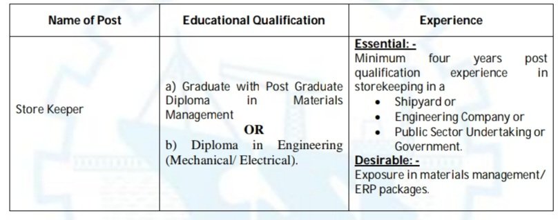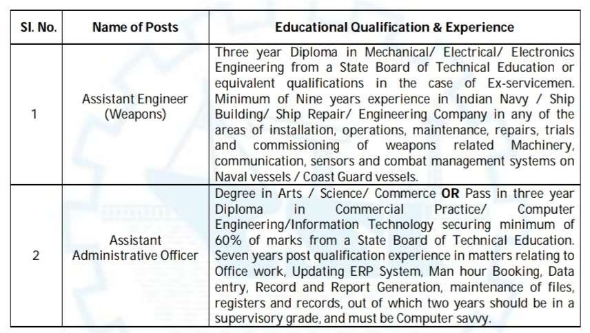•అసిస్టెంట్ ఇంజనీర్ :: స్టేట్ బోర్డ్ ఆఫ్ టెక్నికల్ ఎడ్యుకేషన్ నుండి మెకానికల్/ఎలక్ట్రికల్/ఎలక్ట్రానిక్స్ ఇంజనీరింగ్లో మూడేళ్ల డిప్లొమా లేదా మాజీ సైనికుల విషయంలో తత్సమాన అర్హతలు. ఇండియన్ నేవీ/షిప్ బిల్డింగ్/షిప్ రిపేర్/ఇంజనీరింగ్ కంపెనీలో ఇన్స్టాలేషన్, ఆపరేషన్స్, మెయింటెనెన్స్, రిపేర్స్, ట్రయల్స్ మరియు కమీషనింగ్ ఆఫ్ ఆయుధ సంబంధిత యంత్రాలు వంటి వాటిలో కనీసం తొమ్మిది సంవత్సరాల అనుభవం. నావల్ వెసల్స్ / కోస్ట్ గార్డ్ వెసల్స్లో కమ్యూనికేషన్, సెన్సార్లు మరియు కంబాట్ మేనేజ్మెంట్ సిస్టమ్స్.