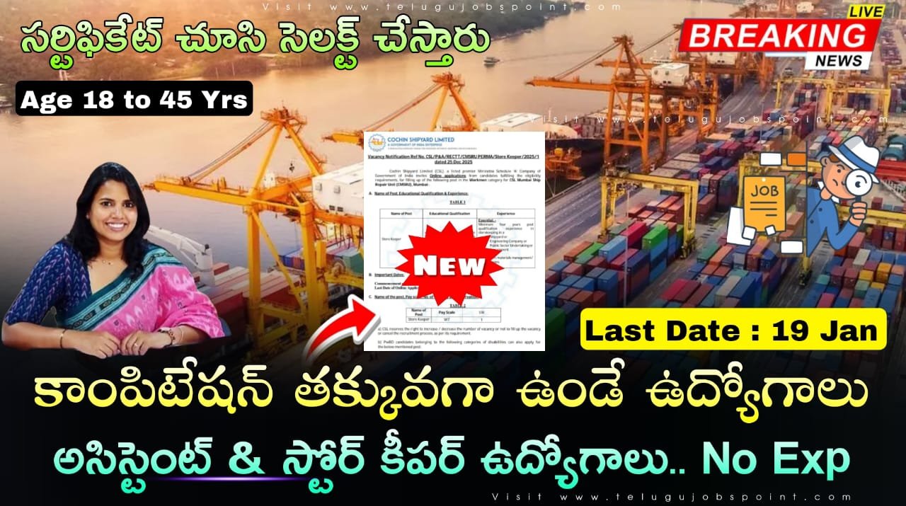 CMSRU Recruitment 2025 Latest Assistant & Storekeeper Job Notification 2025 Apply Now: నిరుద్యోగులకు మంచి అదిరిపోయే శుభవార్త ఎందుకంటే ఈరోజు మేము మీకోసం.. కొచ్చిన్ షిప్యార్డ్ లిమిటెడ్ (CSL), ముంబైలోని CSL ముంబై షిప్ రిపేర్ యూనిట్ (CMSRU) కోసం అసిస్టెంట్ ఇంజనీర్, అసిస్టెంట్ అడ్మినిస్ట్రేటివ్ ఆఫీసర్ & స్టోర్ కీపర్ సూపర్వైజరీ పోస్టుల భర్తీకి అర్హత అవసరాలను తీర్చే భారతీయ పౌరుల నుండి ఆన్లైన్ దరఖాస్తులను ఆహ్వానిస్తుంది. ఈ ఉద్యోగాలకి ఏదైనా డిగ్రీ లేదా డిప్లమా పాస్ అయిన అభ్యర్థులు అప్లై చేసుకోవచ్చు. షెడ్యూల్డ్ కులం (SC)/ షెడ్యూల్డ్ తెగ (ST) & PwBD దరఖాస్తుదారులు దరఖాస్తు రుసుము చెల్లించాల్సిన అవసరం లేదు. స్టోర్ కీపర్ ఉద్యోగాలకి స్టార్టింగ్ శాలరీ రూ.45,623/- & అసిస్టెంట్ ఇంజనీర్, అసిస్టెంట్ అడ్మినిస్ట్రేటివ్ ఆఫీసర్ పోస్టుకు ₹60,704/- ఇస్తారు. గరిష్ట వయోపరిమితి 19 జనవరి 2026 నాటికి 45 సంవత్సరాలు మించకూడదు. అర్హత కలిగిన అభ్యర్థులు తమ దరఖాస్తును www.cochinshipyard.in (కెరీర్ పేజీCMSRU) వెబ్సైట్ ద్వారా 25 డిసెంబర్ 2025 నుండి 19 జనవరి 2026 వరకు ఆన్లైన్ లో దరఖాస్తు చేసుకోవాలి.