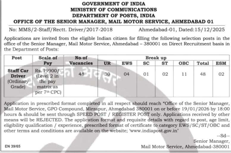»ఎలా దరఖాస్తు చేయాలి : అర్హత కలిగిన అభ్యర్థులు తమ దరఖాస్తులను అనుబంధం-1లోని నిర్దేశిత ఫార్మాట్లో మాత్రమే సమర్పించవచ్చు, వారి ఇటీవలి పాస్పోర్ట్ సైజు ఫోటోగ్రాఫ్ను సరిగ్గా పూరించి, “గుజరాత్ సర్కిల్లోని స్టాఫ్ కార్ డ్రైవర్ (ఆర్డినరీ గ్రేడ్) పోస్ట్కు నియామక దరఖాస్తు” అని పైన వ్రాసిన కవరులో ఎన్క్లోజర్లతో పాటు సీనియర్ మేనేజర్ (GR.A), మెయిల్ మోటార్ సర్వీస్, GPO కాంపౌండ్, సలాపాస్ రోడ్, మీర్జాపూర్, అహ్మదాబాద్ 380001 అనే చిరునామాకు సమర్పించాలి. తద్వారా 19.01.2026న సాయంత్రం 6:00 గంటలకు ముందు స్పీడ్ పోస్ట్/రిజిస్టర్డ్ పోస్ట్ ద్వారా మాత్రమే చేరుకోవచ్చు. ప్రైవేట్ కొరియర్ ద్వారా, రిజిస్టర్ చేయని పోస్ట్ సాధారణ మెయిల్ ద్వారా ఇతర మార్గాల ద్వారా మరియు చేతితో పంపిన దరఖాస్తు అంగీకరించబడదు. దరఖాస్తు ఫారమ్ను https://www.indiapost.gov వెబ్సైట్ నుండి “Recruitment of Staff Car Driver in Gujarat Circle Ahmedabad” లింక్ కింద డౌన్లోడ్ చేసుకోవచ్చు.
