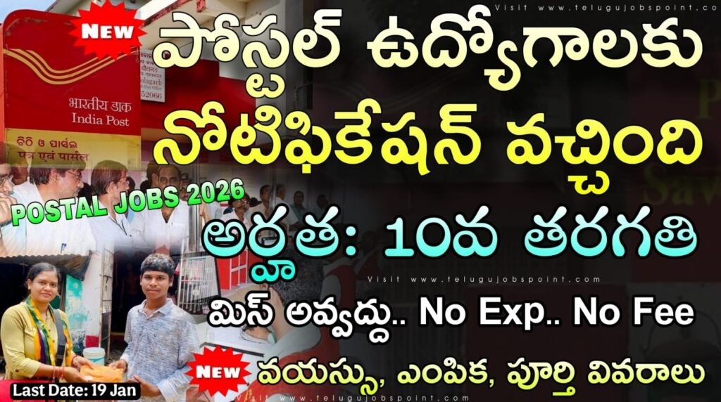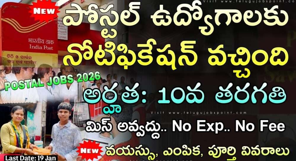 Postal Recruitment 2025 Latest Staff Car Driver Job Notification 2025 Apply Now: భారత ప్రభుత్వం, కమ్యూనికేషన్ మంత్రిత్వ శాఖ తపాలా శాఖలో పదో తరగతి పాస్ అయిన అభ్యర్థులకు శుభవార్త..మెయిల్ మోటార్ సర్వీస్ లోని సీనియర్ మేనేజర్ కార్యాలయంలో పోస్టల్ విభాగంలో డైరెక్ట్ రిక్రూట్మెంట్ ప్రాతిపదికన కింది గ్రూప్ సి పోస్టుల భర్తీకి అర్హులైన భారతీయ పౌరుల నుండి దరఖాస్తులు ఆహ్వానించబడ్డాయి. వయసు 18 సంవత్సరాల నుంచి 33 సంవత్సరాల మధ్యలో అభ్యర్థులు అప్లై చేసుకోవచ్చు. తప్పనిసరిగా 10వ తరగతి పాస్ అయి ఉండాలి. మహిళా దరఖాస్తుదారులు మరియు SC/ST దరఖాస్తుదారులకు రుసుము చెల్లింపు మినహాయింపు ఉంది. ఈ నోటిఫికేషన్ లో మ్యాట్రిక్స్ ప్రకారం లెవల్-2లో రూ. 19,900-రూ. 63,200/-ప్లస్ అనుమతించదగిన అలవెన్సులు ఇవ్వడం జరుగుతుంది. దరఖాస్తు ఫారమ్ను https://www.indiapost.gov వెబ్సైట్ నుండి పూర్తి చేసిన నిర్ణీత ఫార్మాట్లోని దరఖాస్తును 19/01/2026న సాయంత్రం 6 గంటలలోపు ఆఫ్ లైన్ లో అప్లై చేయాలి.