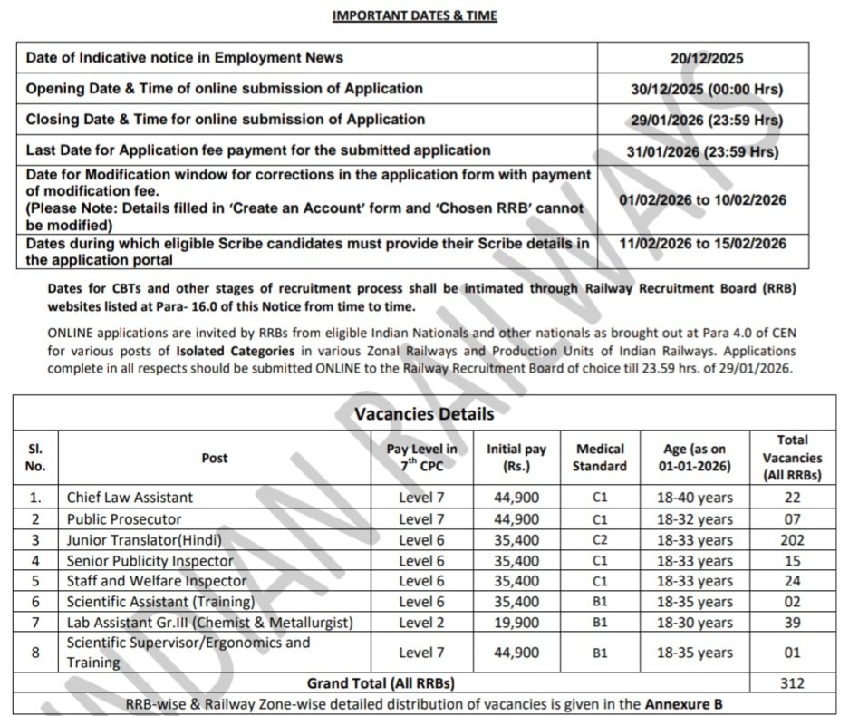 రైల్వే మంత్రిత్వ శాఖ రైల్వే రిక్రూట్మెంట్ బోర్డు (RRB) లో కేంద్రీకృత ఉద్యోగ నోటీసు (CEN) నం: 08/2025 ఐసోలేటెడ్ కేటగిరీలలో చీఫ్ లా అసిస్టెంట్, పబ్లిక్ ప్రాసిక్యూటర్, జూనియర్ అనువాదకులు (హిందీ), సీనియర్ పబ్లిసిటీ ఇన్స్పెక్టర్, స్టాఫ్ అండ్ వెల్ఫేర్ ఇన్స్పెక్టర్, సైంటిఫిక్ అసిస్టెంట్ (శిక్షణ), ల్యాబ్ అసిస్టెంట్ Gr.III (కెమిస్ట్ & మెటలర్జిస్ట్) & సైంటిఫిక్ సూపర్వైజర్/ఎర్గోనామిక్స్ వివిధ 312 పోస్టులకు నియామకం కోసం కొత్త నోటిఫికేషన్ వచ్చేసింది. 12th పాస్ చాలు.. వయసు 18 సంవత్సరాల నుంచి 40 సంవత్సరాల మధ్య వయసు కలిగి ఉండాలి. అప్లై చేసుకుంటే సొంత రాష్ట్రంలో రైల్వే శాఖలో పర్మనెంట్ ఉద్యోగం పొందువచ్చు. ఆన్లైన్ దరఖాస్తు సమర్పణ ప్రారంభ తేదీ & సమయం 30/12/2025 (00:00 గంటలు) నుంచి దరఖాస్తు ఆన్లైన్ సమర్పణకు చివరి తేదీ & సమయం 29/01/2026 (23:59 గంటలు) లోపు www.indianrailways.gov.in/ ఆన్లైన్లో దరఖాస్తు చేసుకోవాలి.
