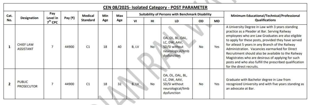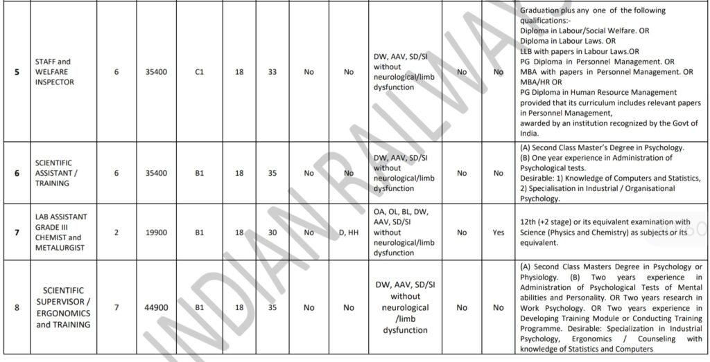 •చీఫ్ లా అసిస్టెంట్ :: న్యాయశాస్త్రంలో విశ్వవిద్యాలయ డిగ్రీ మరియు బార్లో ప్లీడర్గా 3 సంవత్సరాల స్టాండింగ్ ప్రాక్టీస్. రైల్వే అడ్మినిస్ట్రేషన్లోని ఏదైనా బ్రాంచ్లో కనీసం 5 సంవత్సరాలు పనిచేసిన న్యాయ పట్టా పొందిన రైల్వే ఉద్యోగులు కూడా ఈ పోస్టులకు దరఖాస్తు చేసుకోవడానికి అర్హులు.