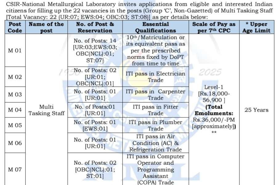 Latest CSIR NML Multi Tasking Staff Job Recruitment 2026 Apply 22 Vacancy Overview :