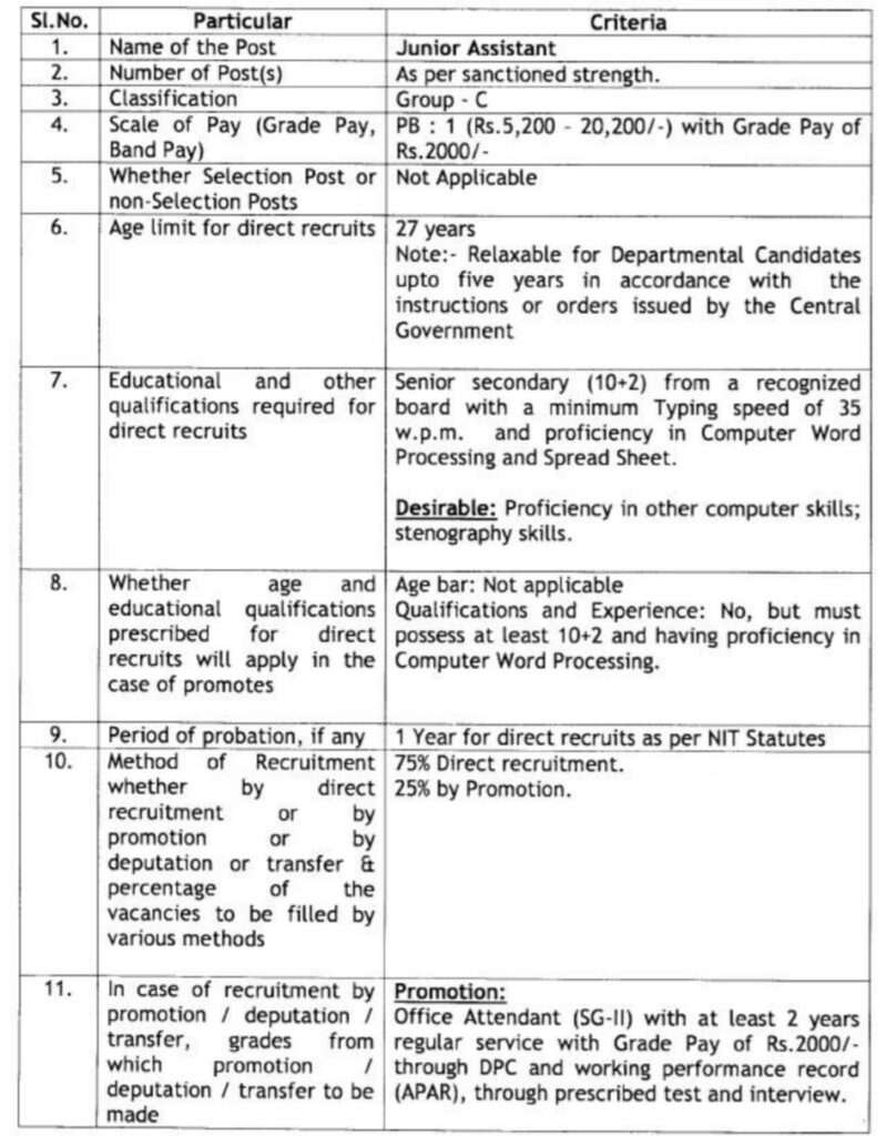 •జూనియర్ అసిస్టెంట్ :: గుర్తింపు పొందిన బోర్డు నుండి సీనియర్ సెకండరీ (10+2) ఉత్తీర్ణత మరియు కనీసం 35 పదాల టైపింగ్ వేగం మరియు కంప్యూటర్ వర్డ్ ప్రాసెసింగ్ మరియు స్ప్రెడ్షీట్లో ప్రావీణ్యం. కావాల్సినది: ఇతర కంప్యూటర్ నైపుణ్యాలలో ప్రావీణ్యం; స్టెనోగ్రఫీ నైపుణ్యాలు.