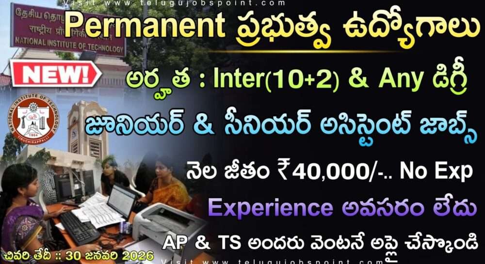 నిరుద్యోగులకు భారీ శుభవార్త.. కేవలం ఇంటర్మీడియట్ లేదా ఏదైనా డిగ్రీ పాసైన అభ్యర్థులకు.. తిరుచిరాపల్లిలోని నేషనల్ ఇన్స్టిట్యూట్ ఆఫ్ టెక్నాలజీలో సూపరింటెండెంట్, జూనియర్ అసిస్టెంట్ మరియు సీనియర్ అసిస్టెంట్ పోస్టులకు నియామకం కోసం అద్భుతమైన విద్యా రికార్డు మరియు సంబంధిత పని అనుభవం ఉన్న భారతీయ పౌరుల నుండి ఆన్లైన్ దరఖాస్తులను ఆహ్వానిస్తున్నారు. వయసు 18 సంవత్సరాల నుంచి 33 సంవత్సరాల మధ్యలో ఉండాలి. ఈ నోటిఫికేషన్ లో సెలెక్ట్ అయితే నెల రూ.₹25,500/-to ₹1,12,400/- జీతం ఇస్తారు. ఆన్లైన్ దరఖాస్తు, విద్యా అర్హతలు, అనుభవం, ఇతర అవసరాలు మరియు నిబంధనలు & షరతులకు సంబంధించిన వివరాల కోసం, దయచేసి ఇన్స్టిట్యూట్ వెబ్సైట్ http://www.nitt.edu ని సందర్శించండి. ఆసక్తిగల వ్యక్తులు ఇన్స్టిట్యూట్ వెబ్సైట్లో అందుబాటులో ఉన్న నిర్ణీత దరఖాస్తు ఫారమ్లో ఆన్లైన్లో దరఖాస్తు చేసుకోవచ్చు. ఆన్లైన్ దరఖాస్తును సమర్పించడానికి చివరి తేదీ 30.01.2026.
