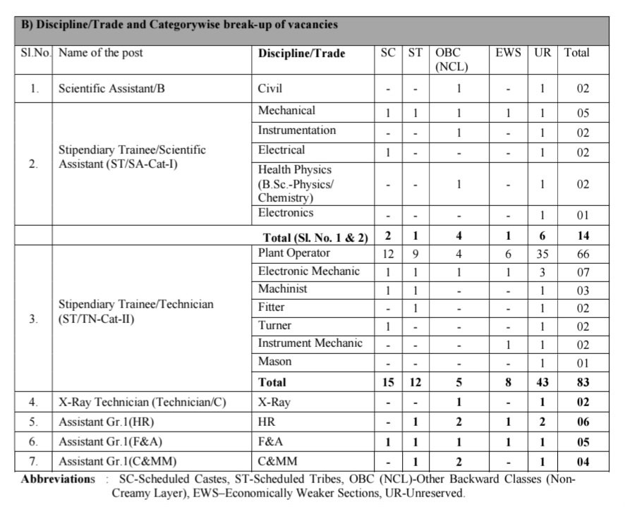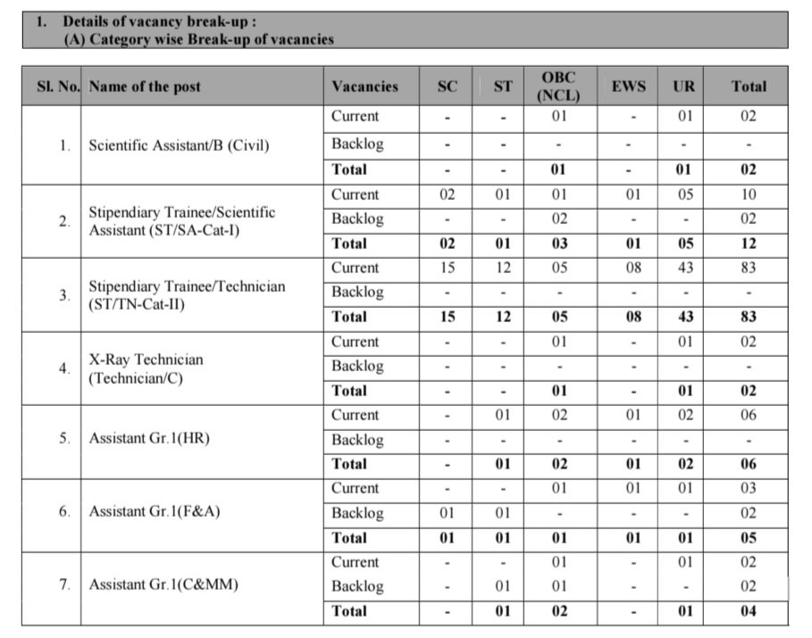 •సైంటిఫిక్ అసిస్టెంట్/బి (సివిల్), స్టైపెండియరీ ట్రైనీ/సైంటిఫిక్ అసిస్టెంట్ (ST/SA-క్యాట్-1), ఎక్స్-రే టెక్నీషియన్ (టెక్నీషియన్/సి), అసిస్టెంట్ గ్రేడ్ I ఉద్యోగాలు భర్తీ చేస్తున్నారు. మొత్తం ఉద్యోగాలు 114 ఖాళీలు ఉన్నాయి.
