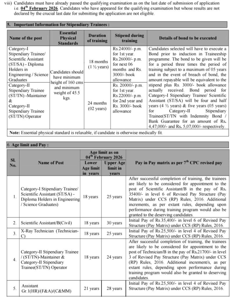 •స్టైపెండియరీ ట్రైనీ (ST/TN) :: సైన్స్ సబ్జెక్టు(లు) మరియు గణితంలో వ్యక్తిగతంగా కనీసం 50% మార్కులతో SSC (10వ తరగతి) 2 సంవత్సరాల III సర్టిఫికేట్ సంబంధిత వాణిజ్యం. ITI కోర్సు వ్యవధి 02 (రెండు) సంవత్సరాల కంటే తక్కువ ఉన్న ట్రేడ్ల కోసం, అభ్యర్థులు కనీసం (01 (ఒకటి) కోర్సు పూర్తయిన తర్వాత సంబంధిత రంగంలో సంవత్సరం పని అనుభవం. కనీసం SSC (10వ తరగతి) స్థాయి పరీక్షలో ఇంగ్లీష్ ఒక సబ్జెక్టుగా ఉండాలి.