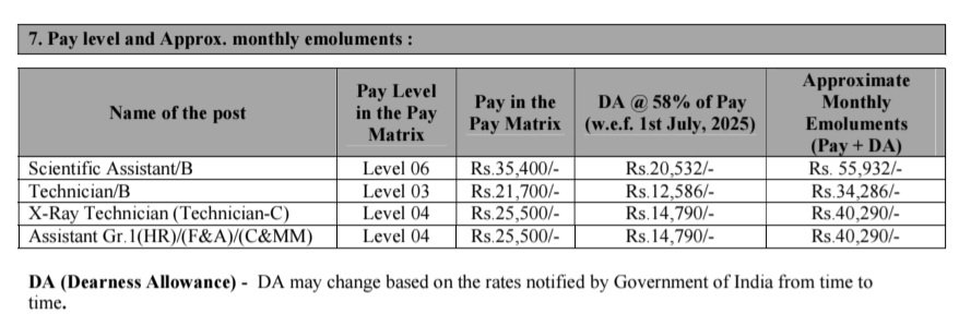 »నెల జీతం : ఈ నోటిఫికేషన్ లో సైంటిఫిక్ అసిస్టెంట్/బి పోస్టుకు ₹55,932/-, సాంకేతిక నిపుణుడు/బి పోస్టుకు ₹రూ.34,286/-, అసిస్టెంట్ గ్రేడ్ 1 & ఎక్స్-రే టెక్నీషియన్ (టెక్నీషియన్-సి) పోస్టుకు రూ.40,290/- జీతం ఇస్తారు. భారత ప్రభుత్వం కాలానుగుణంగా ప్రకటించే రేట్ల ఆధారంగా డీఏ (డియర్నెస్ అలవెన్స్) డీఏ మారవచ్చు.