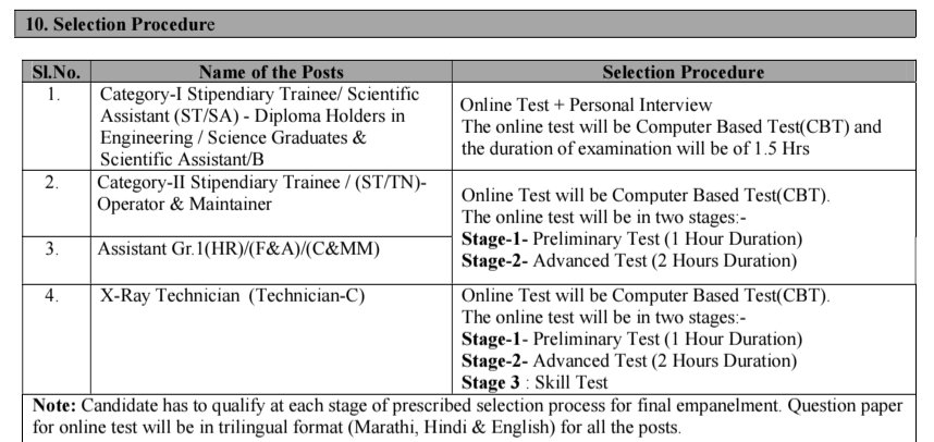 •స్టైపెండియరీ ట్రైనర్ (ST/TN) ఆపరేటర్ :: కనీసం 50% మార్కులతో సైన్స్ స్ట్రీమ్లో HSC (10+2) లేదా ISC (ఫిజిక్స్, కెమిస్ట్రీ మరియు మ్యాథమెటిక్స్ సబ్జెక్టులతో) ఉత్తీర్ణత. కనీసం SSC స్థాయి పరీక్షలో ఇంగ్లీషును ఒక సబ్జెక్టుగా కలిగి ఉండాలి.