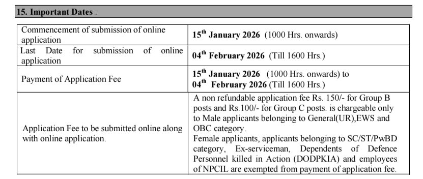 »ఎలా దరఖాస్తు చేయాలి : అర్హత గల దరఖాస్తుదారులు www.npcilcareers.co.in వెబ్సైట్లో అందించిన విధంగా ఆన్లైన్ దరఖాస్తు ఫారమ్ ద్వారా మాత్రమే దరఖాస్తు చేసుకోవాలి. చేతితో రాసిన/టైప్ చేసిన హార్డ్ ఫార్మాట్ దరఖాస్తులతో సహా ఏదైనా ఇతర రూపంలో సమర్పించిన దరఖాస్తులను స్వయంగా లేదా ఇతర మార్గాల ద్వారా అందజేయడం అంగీకరించబడదు. NPCILకి ఏ పత్రాలు/దరఖాస్తు మొదలైన వాటిని పంపవద్దు. ఆన్లైన్ రిజిస్ట్రేషన్ 15 జనవరి 2026 నుండి 10:00 గంటలకు ప్రారంభమవుతుంది మరియు 04 ఫిబ్రవరి 2026న 4.00 గంటలకు ముగుస్తుంది.