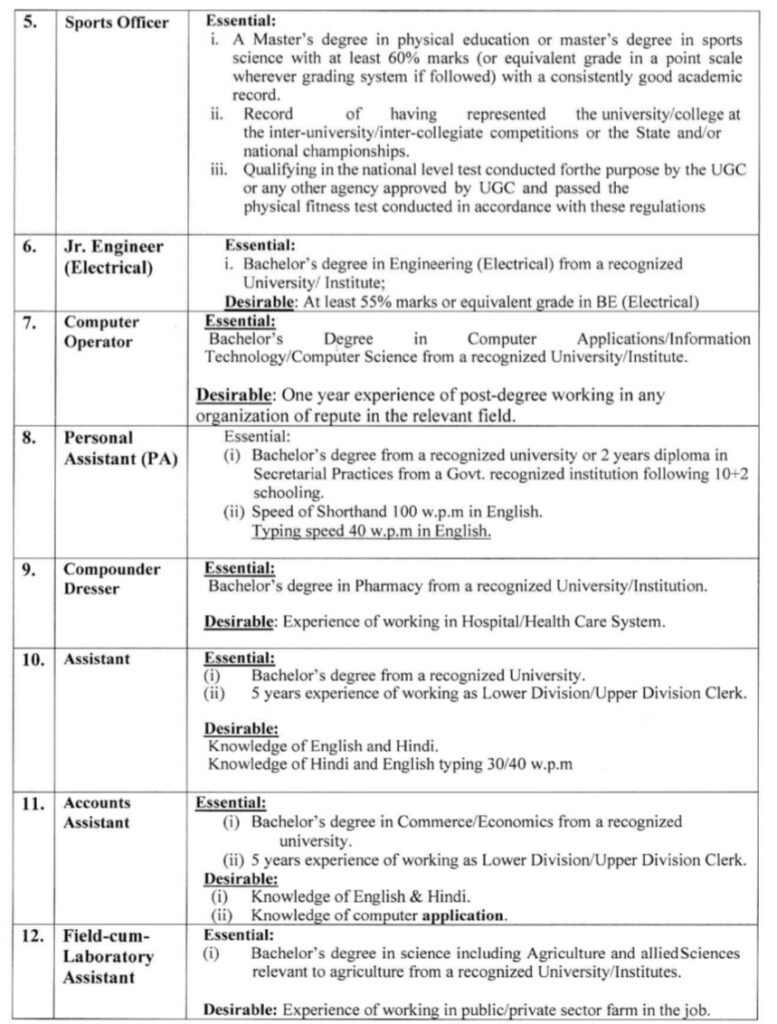 •ఫీల్డ్-కమ్-లాబొరేటరీ అసిస్టెంట్ :: గుర్తింపు పొందిన విశ్వవిద్యాలయం/సంస్థల నుండి వ్యవసాయానికి సంబంధించిన వ్యవసాయం మరియు అనుబంధ శాస్త్రాలు సహా సైన్స్లో బ్యాచిలర్ డిగ్రీ. కావాల్సినది: ప్రభుత్వ/ప్రైవేట్ రంగ వ్యవసాయ క్షేత్రంలో పనిచేసిన అనుభవం.