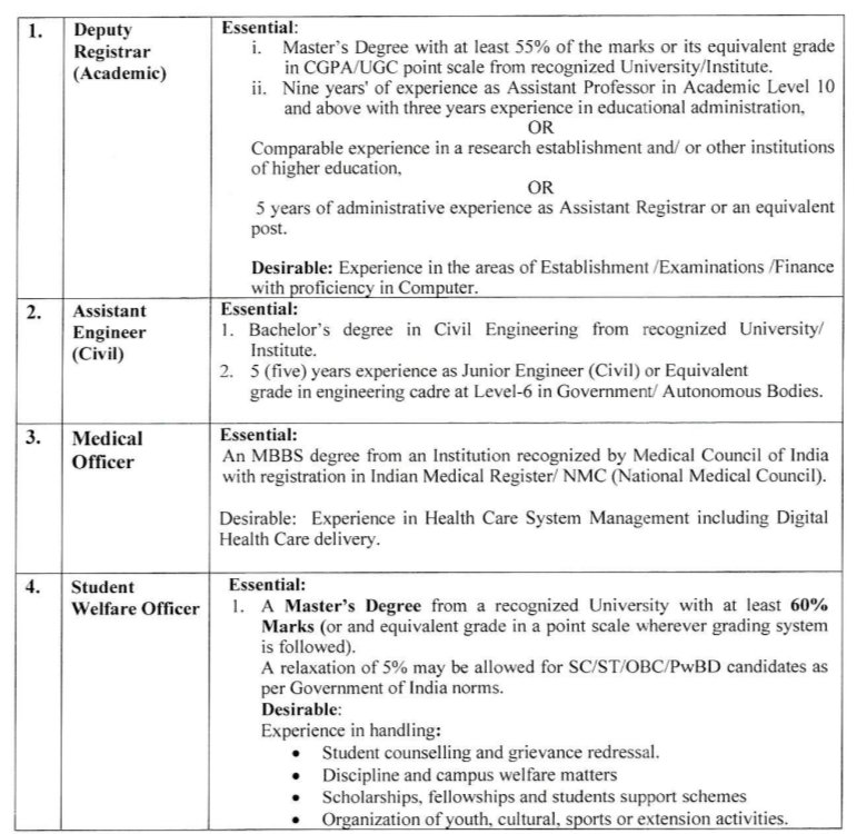 పోస్ట్ పేరు :: డిప్యూటీ రిజిస్ట్రార్, అసిస్టెంట్ ఇంజనీర్, మెడికల్ ఆఫీసర్, విద్యార్థి సంక్షేమ అధికారి, స్పోర్ట్స్ ఆఫీసర్, జూనియర్ ఇంజనీర్, కంప్యూటర్ ఆపరేటర్, పర్సనల్ అసిస్టెంట్, UDC, అకౌంట్స్ అసిస్టెంట్, డ్రైవర్, ఫీల్డ్-కమ్-లాబొరేటరీ అసిస్టెంట్ & మల్టీ-టాస్కింగ్ స్టాఫ్ పోస్టులు ఉన్నాయి.
