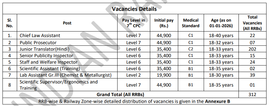 Latest RRB Isolated Category Recruitment 2026 Latest lab assistant Job Notification 2026 Apply Now: భారత ప్రభుత్వం, రైల్వే మంత్రిత్వ శాఖ రైల్వే రిక్రూట్మెంట్ బోర్డు(RRB) ద్వారా ఐసోలేటెడ్ కేటగిరీలలోని 312 పోస్టులకు నియామకం కోసం నోటిఫికేషన్ విడుదల విడుదల చేసిన సంగతి తెలిసిందే. ఇందులో మీకు అప్లై చేసుకునే వీలుగా కేవలం ఇంటర్మీడియట్ అర్హతతో ల్యాబ్ అసిస్టెంట్ 39 ఉద్యోగాలు ఉన్నాయి. ఈ ఉద్యోగాలకు 18 సంవత్సరాలు నుంచి 30 సంవత్సరాల మధ్యలో వయసు కలిగి ఉండాలి. ప్రభుత్వ నిబంధనల ప్రకారం వయసు సడలింపు ఉంటుంది. పే లెవల్ 2: రూ.₹19,900/- to ₹63,200/- మధ్య శాలరీ ఇస్తారు. దరఖాస్తు ఆన్లైన్ సమర్పణకు చివరి తేదీ & సమయం 29/01/2026 (23:59 గంటలు) లోపు https://www.rrbapply.gov.in/ చివరి తేదీ లోపు ఆన్లైన్లో దరఖాస్తు చేసుకోవాలి.