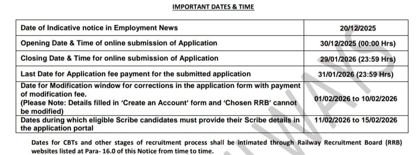 »ఎలా దరఖాస్తు చేయాలి : బోర్డు (RRB) వెబ్సైట్ల https://www.rrbapply.gov.in/ ద్వారా ఎప్పటికప్పుడు తెలియజేయబడుతుంది. వివిధ జోనల్ రైల్వేలు మరియు భారతీయ రైల్వేల ఉత్పత్తి యూనిట్లలోని ఐసోలేటెడ్ కేటగిరీల వివిధ పోస్టుల కోసం CEN యొక్క పేరా 4.0లో పేర్కొన్న అర్హత కలిగిన భారతీయ జాతీయులు మరియు ఇతర జాతీయుల నుండి RRBలు https://www.rrbapply.gov.in/ ఆన్లైన్ దరఖాస్తులను ఆహ్వానిస్తున్నాయి. అన్ని విధాలుగా పూర్తి చేసిన దరఖాస్తులను 29/01/2025 23.59 గంటలలోపు ఎంపిక చేసుకున్న రైల్వే రిక్రూట్మెంట్ బోర్డుకు ఆన్లైన్లో సమర్పించాలి.