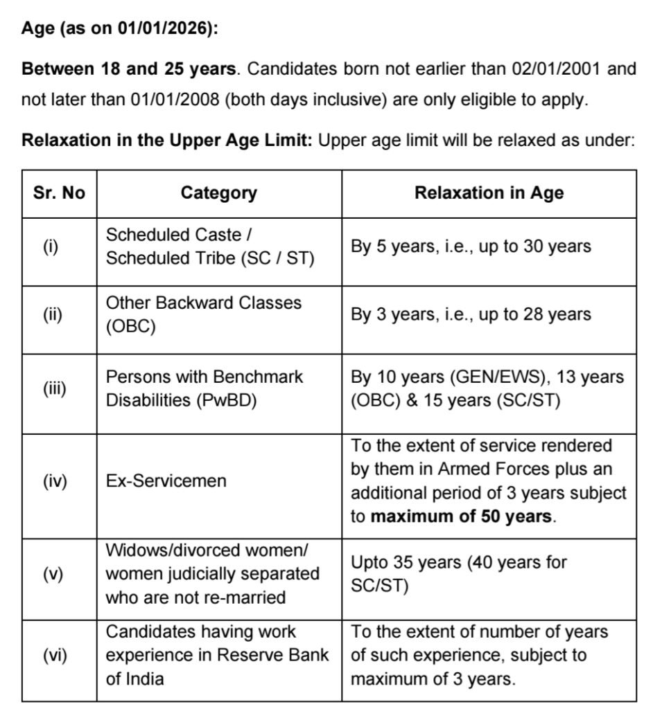 »వయోపరిమితి: వయస్సు (01/01/2026 నాటికి): 18 నుండి 25 సంవత్సరాల మధ్య వయస్సు గల అభ్యర్థులు 02/01/2001 కంటే ముందు మరియు 01/01/2008 తర్వాత (రెండు రోజులు కలుపుకొని) జన్మించిన వారు మాత్రమే దరఖాస్తు చేసుకోవడానికి అర్హులు.