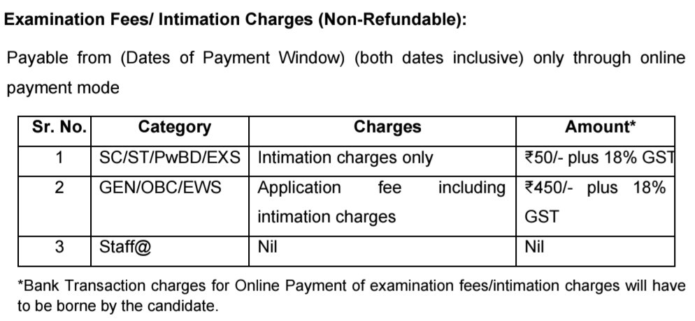 »దరఖాస్తు రుసుము :: ఎస్సీ/ఎస్టీ/వికలాంగులు/మాజీ విద్యార్థులు ₹50/- ప్లస్ 18% GST & జనరల్/ఓబీసీ/ఇడబ్ల్యూఎస్ ₹450/- ప్లస్ 18% పరీక్ష ఫీజులు/ఇంటిమేషన్ ఛార్జీల ఆన్లైన్ చెల్లింపు కోసం బ్యాంక్ లావాదేవీ ఛార్జీలను అభ్యర్థి చెల్లించాలి.