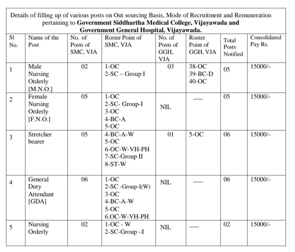 ఆంధ్రప్రదేశ్ ప్రభుత్వం వైద్య విద్య విభాగం ప్రభుత్వ సిద్ధార్థ వైద్య కళాశాల ప్రిన్సిపాల్ మరియు విజయవాడలోని ప్రభుత్వ జనరల్ హాస్పిటల్ సూపరింటెండెంట్ నియంత్రణలో ఉన్న N.T.R జిల్లాలోని ఆరోగ్య సంస్థలలో మేల్ నర్సింగ్ ఆర్డర్లీ (Μ.Ν.Ο), మహిళా నర్సింగ్ ఆర్డర్లీ (F.N.O), స్ట్రెచర్ బేరర్, జనరల్ డ్యూటీ అటెండెంట్ (GDA) & నర్సింగ్ ఆర్డర్లీ వివిధ పోస్టులకు అవుట్ సోర్సింగ్ ప్రాతిపదికన నియామకం కోసం నోటిఫికేషన్ విడుదల చేశారు. ఈ ఉద్యోగులకు కేవలం పదో తరగతి పాస్ అంటే చాలు, నెలలు 15000 వరకు స్టార్టింగ్ సాలరీ ఇస్తారు. అప్లై చేసుకుంటే సొంత జిల్లాలో ఉద్యోగం వస్తుంది అప్లై చేసుకోండి రాత పరీక్ష లేదు డైరెక్ట్ ఉద్యోగం సర్టిఫికెట్ చూసి ఇస్తారు. దరఖాస్తు ప్రొఫార్మా https://ntr.ap.gov.in పోర్టల్‌లో 22/01/2026 నుండి 31/01/2026 వరకు ఉదయం 10:30 గంటల నుండి సాయంత్రం 5.00 గంటల వరకు (కార్యాలయ పనివేళల్లో) అందుబాటులో ఉంటుంది.