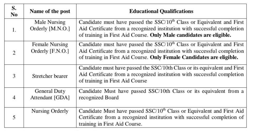 •నర్సింగ్ ఆర్డర్లీ :: అభ్యర్థి గుర్తింపు పొందిన సంస్థ నుండి SSC/10వ తరగతి లేదా తత్సమాన మరియు ప్రథమ చికిత్స సర్టిఫికెట్ ఉత్తీర్ణులై ఉండాలి మరియు ప్రథమ చికిత్స కోర్సులో శిక్షణను విజయవంతంగా పూర్తి చేసి ఉండాలి.