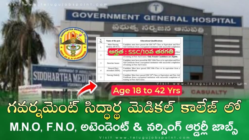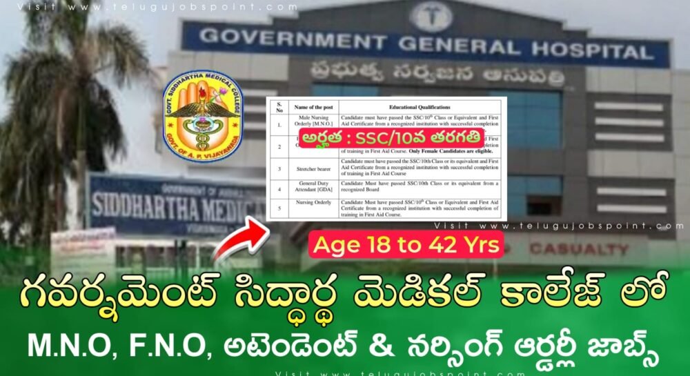 Latest AP Government Siddhartha Medical College Recruitment 2026 Latest ΜΝΟ, FNO & Attendant Job Notification 2026 Apply Now : ఎటువంటి రాత పరీక్ష లేకుండా కేవలం 10వ తరగతి పాస్ అయిన అభ్యర్థుల కోసంగవర్నమెంట్ సిద్ధార్థ మెడికల్ కాలేజ్ మరియు సూపరింటెండెంట్, గవర్నమెంట్ జనరల్ హాస్పిటల్ లో మేల్ నర్సింగ్ ఆర్డర్లీ (Μ.Ν.Ο), మహిళా నర్సింగ్ ఆర్డర్లీ (F.N.O), స్ట్రెచర్ బేరర్, జనరల్ డ్యూటీ అటెండెంట్ (GDA) & నర్సింగ్ ఆర్డర్లీ అవుట్ సోర్సింగ్ ప్రాతిపదికన ఉద్యోగుల కోసం నోటిఫికేషన్ విడుదల చేశారు.  ఈ ఉద్యోగాలకు అప్లై చేసుకోవడానికి చివరి తేదీ : 31/01/2026 వరకు ఉదయం 10:30 గంటల నుండి సాయంత్రం 5.00 గంటల  లోపు ఆఫ్ లైన్ లో అప్లై చేయాలి.