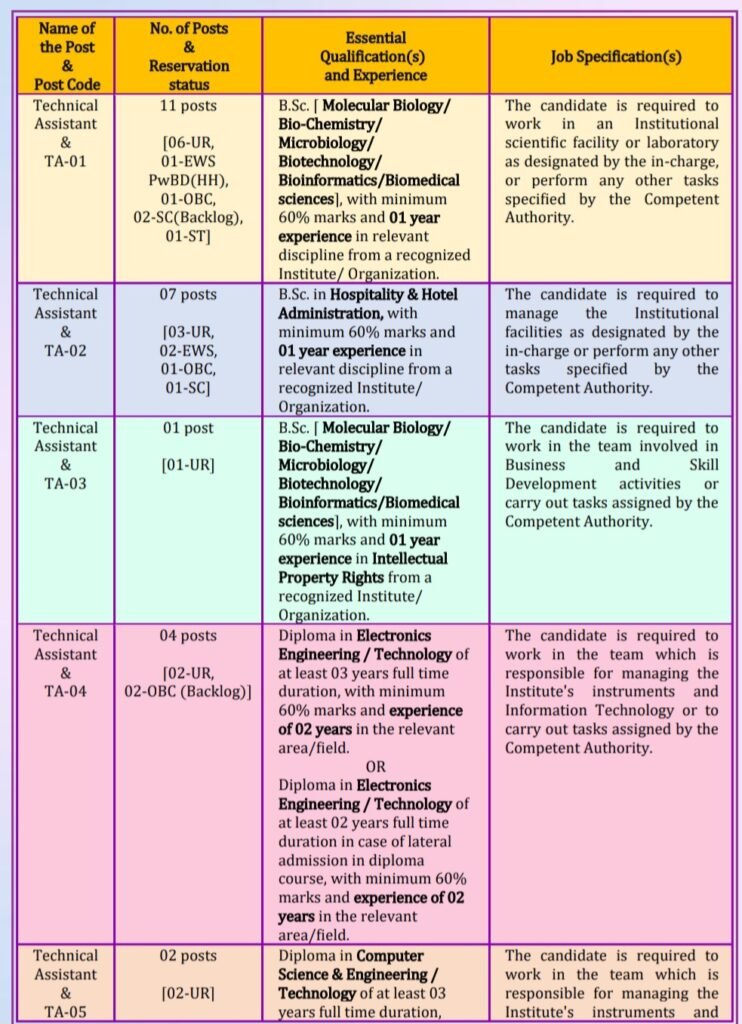 టెక్నికల్ అసిస్టెంట్ : గుర్తింపు పొందిన సంస్థ/సంస్థ నుండి కనీసం 60% మార్కులతో B.Sc. మాలిక్యులర్ బయాలజీ/బయో-కెమిస్ట్రీ/మైక్రోబయాలజీ/బయోటెక్నాలజీ/బయోఇన్ఫర్మేటిక్స్/బయోమెడికల్ సైన్సెస్) ఉత్తీర్ణత మరియు సంబంధిత విభాగంలో 01 సంవత్సరం అనుభవం. లేదా సంబంధిత ప్రాంతం/రంగంలో కనీసం 60% మార్కులతో కనీసం 03 సంవత్సరాల పూర్తి సమయం వ్యవధి గల ఎలక్ట్రానిక్స్ ఇంజనీరింగ్/టెక్నాలజీ డిప్లొమా. లేదా సంబంధిత ప్రాంతం/రంగంలో కనీసం 60% మార్కులతో కనీసం 2 సంవత్సరాల పూర్తి సమయం వ్యవధి గల ఎలక్ట్రానిక్స్ ఇంజనీరింగ్/టెక్నాలజీ డిప్లొమా. కోర్సులో పార్శ్వ ప్రవేశం పొందినట్లయితే, సంబంధిత ప్రాంతం/రంగంలో కనీసం 60% మార్కులతో కనీసం 2 సంవత్సరాల పూర్తి సమయం వ్యవధి గల ఎలక్ట్రానిక్స్ ఇంజనీరింగ్/టెక్నాలజీ డిప్లొమా. కంప్యూటర్ సైన్స్ & ఇంజనీరింగ్/టెక్నాలజీలో కనీసం 03 సంవత్సరాల పూర్తి సమయం డిప్లొమా, కనీసం 60% మార్కులతో మరియు సంబంధిత ప్రాంతం/క్షేత్రంలో 02 సంవత్సరాల అనుభవం.