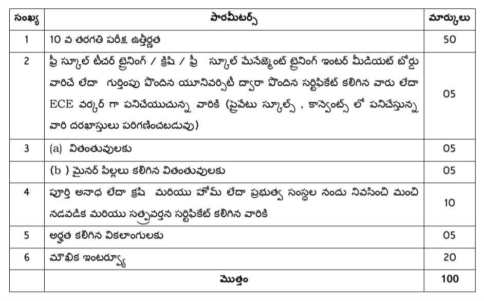 •అంగన్వాడీ కార్యకర్త పోస్టుకు 10వ తరగతి, ఆయా పోస్టుకు 7వ తరగతి విద్యార్హత ఉండాలని తెలియజేస్తున్నారు. ప్రధానముగా స్థానిక స్థిర నివాసం కలిగిన వివాహిత స్త్రీ అభ్యర్థి అయి ఉండాలి.
