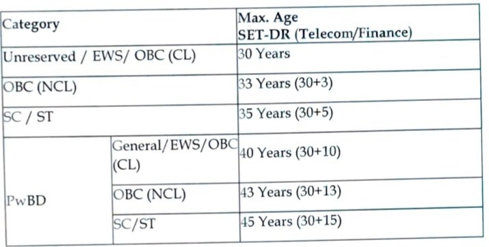 »వయోపరిమితి: దరఖాస్తు స్వీకరణ చివరి తేదీ నాటికి అభ్యర్థి కనీసం 21 సంవత్సరాలు నిండి ఉండాలి మరియు 30 సంవత్సరాలు మించకూడదు. అయితే, ఈ క్రింది వర్గాలకు భారత ప్రభుత్వ స్టాండింగ్ సూచనల ప్రకారం గరిష్ట వయోపరిమితిలో సడలింపు ఉంటుంది.