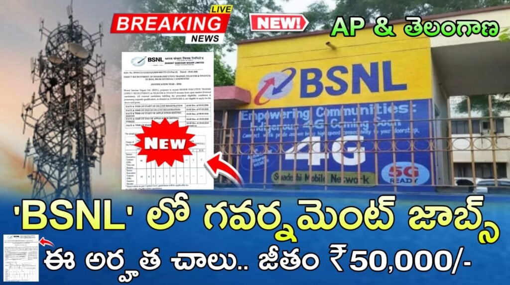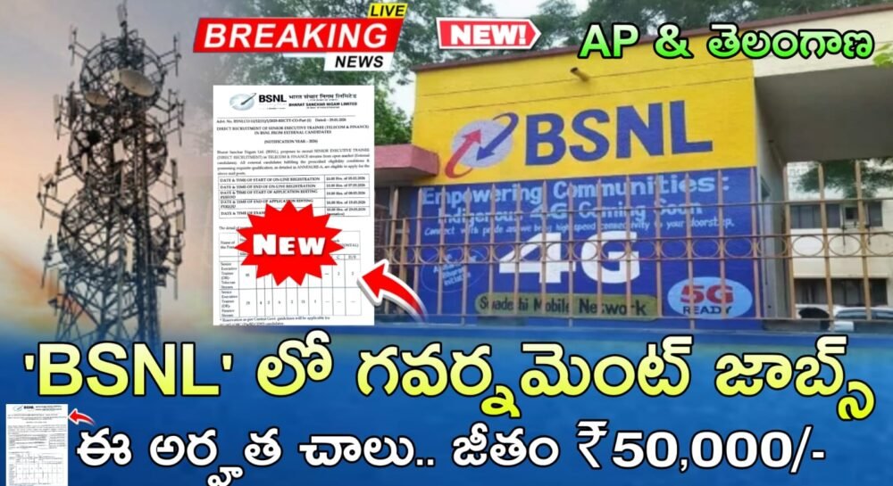 Latest BSNL Recruitment 2026 Latest Senior Executive Trainee Job Notification 2026 Apply Now : భారత్ సంచార్ నిగమ్ లిమిటెడ్ (BSNL) లో ఓపెన్ మార్కెట్ (బాహ్య అభ్యర్థులు) నుండి టెలికాం & ఫైనాన్స్ స్ట్రీమ్లలో సీనియర్ ఎగ్జిక్యూటివ్ ట్రైనీ (డైరెక్ట్ రిక్రూట్మెంట్) నియామకాలను ప్రతిపాదించింది. ఈ నోటిఫికేషన్ లో వయస్సు 21 to 30 సంవత్సరాలు మధ్య ఉండాలి. ఈ నోటిఫికేషన్ లో ఇంజనీరింగ్ డిగ్రీ పూర్తి చేసిన అభ్యర్థుల అప్లై చేసుకోవచ్చు. నెల జీతం రూ.24,900-రూ.50,500/- మధ్య నెల జీతం ఇస్తారు. ఆన్లైన్ రిజిస్ట్రేషన్ ప్రారంభ తేదీ & సమయం 05.02.2026 యొక్క 10.00 గంటలు నుంచి ఆన్లైన్ రిజిస్ట్రేషన్ ముగింపు తేదీ & సమయం 07.03.2026 యొక్క 10.00 గంటలు లోపు BSNL వెబ్సైట్ www.bsnl.co.in లో ఆన్లైన్ లో అప్లై చేసుకోవాలి.