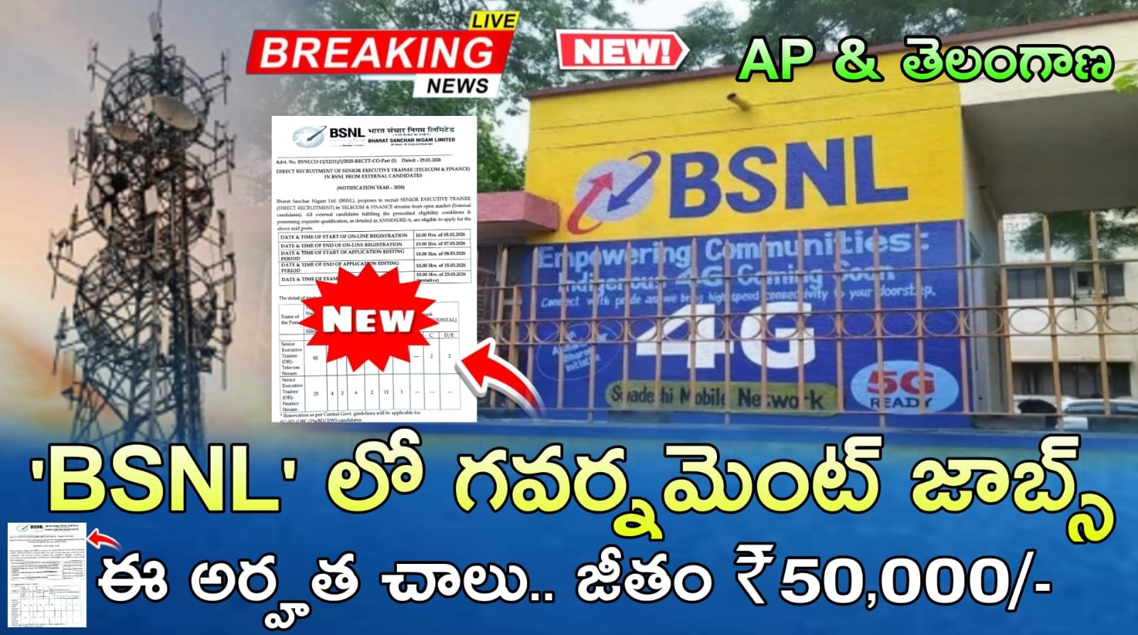 Latest BSNL Recruitment 2026 Latest Senior Executive Trainee Job Notification 2026 Apply Now : భారత్ సంచార్ నిగమ్ లిమిటెడ్ (BSNL) లో ఓపెన్ మార్కెట్ (బాహ్య అభ్యర్థులు) నుండి టెలికాం & ఫైనాన్స్ స్ట్రీమ్లలో సీనియర్ ఎగ్జిక్యూటివ్ ట్రైనీ (డైరెక్ట్ రిక్రూట్మెంట్) నియామకాలను ప్రతిపాదించింది. ఈ నోటిఫికేషన్ లో వయస్సు 21 to 30 సంవత్సరాలు మధ్య ఉండాలి. ఈ నోటిఫికేషన్ లో ఇంజనీరింగ్ డిగ్రీ పూర్తి చేసిన అభ్యర్థుల అప్లై చేసుకోవచ్చు. నెల జీతం రూ.24,900-రూ.50,500/- మధ్య నెల జీతం ఇస్తారు. ఆన్లైన్ రిజిస్ట్రేషన్ ప్రారంభ తేదీ & సమయం 05.02.2026 యొక్క 10.00 గంటలు నుంచి ఆన్లైన్ రిజిస్ట్రేషన్ ముగింపు తేదీ & సమయం 07.03.2026 యొక్క 10.00 గంటలు లోపు BSNL వెబ్సైట్ www.bsnl.co.in లో ఆన్లైన్ లో అప్లై చేసుకోవాలి.
