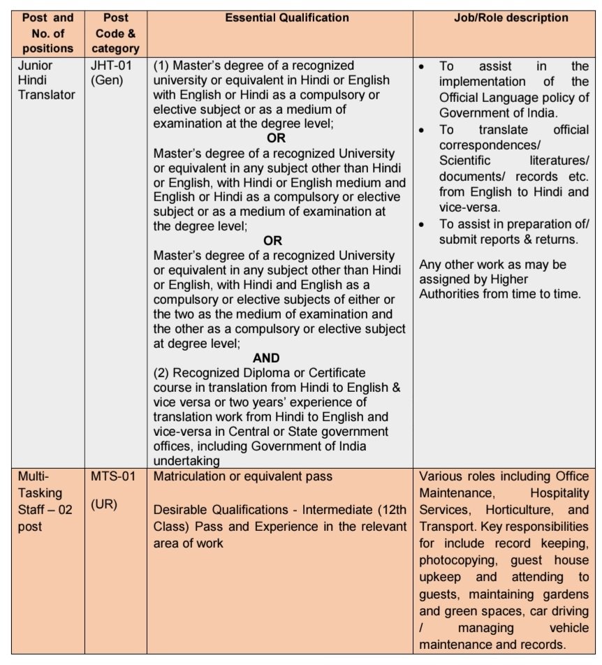 పోస్ట్ పేరు ::జూనియర్ హిందీ ట్రాన్స్లేటర్ & మల్టీ టాస్కింగ్ స్టాఫ్ (MTS) పోస్టులు ఉన్నాయి.