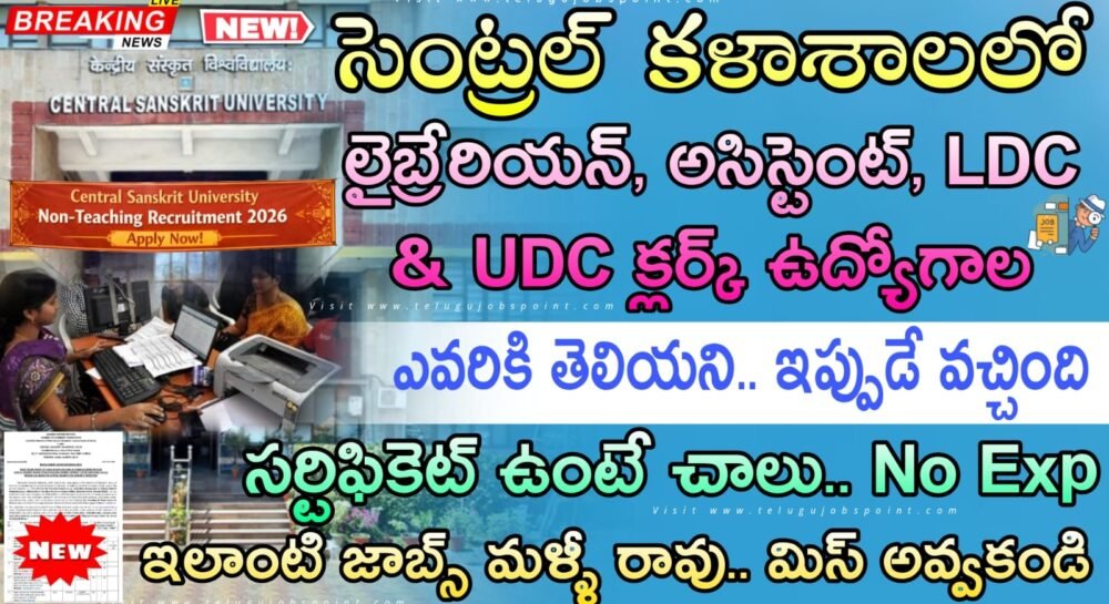 భారత ప్రభుత్వ విద్యా మంత్రిత్వ శాఖలో సెంట్రల్ సంస్కృత విశ్వవిద్యాలయం లో కళాశాల లైబ్రేరియన్, సెక్షన్ ఆఫీసర్, అసిస్టెంట్, ప్రొఫెషనల్ అసిస్టెంట్, అప్పర్ డివిజన్ క్లర్క్ (UDC) & లోయర్ డివిజన్ క్లర్క్ (LDC) ఉద్యోగుల కోసం నోటిఫికేషన్ విడుదల చేశారు. ఈ ఉద్యోగాలకు రూ.44,900-1,42,400/- మధ్యనెల జీతం ఇస్తారు. ఏదైనా డిగ్రీ పాసైన అభ్యర్థులు అప్లై చేసుకోవచ్చు. కేంద్ర ప్రభుత్వ పర్మనెంట్ ఉద్యోగం రెండు తెలుగు రాష్ట్ర అభ్యర్థులు అప్లై చేసుకోవచ్చు. ఆన్లైన్ రిజిస్ట్రేషన్/దరఖాస్తు సమర్పణ ప్రారంభ తేదీ 28.01.2026 (బుధవారం) నుచి ఆన్లైన్ రిజిస్ట్రేషన్/దరఖాస్తు సమర్పణకు చివరి తేదీ 27.02.2026 (శుక్రవారం) రాత్రి 11.30 గంటల వరకు దరఖాస్తుదారులు www.sanskrit.nic.in ఆన్లైన్ లో అప్లై చేయాలి. దరఖాస్తుదారులు www.sanskrit.nic.in లోని “రిక్రూట్మెంట్/నోటిఫికేషన్లు” శీర్షికల క్రింద ఆన్లైన్ పోస్ట్ వారీగా దరఖాస్తు ద్వారా దరఖాస్తు చేసుకోవాలి