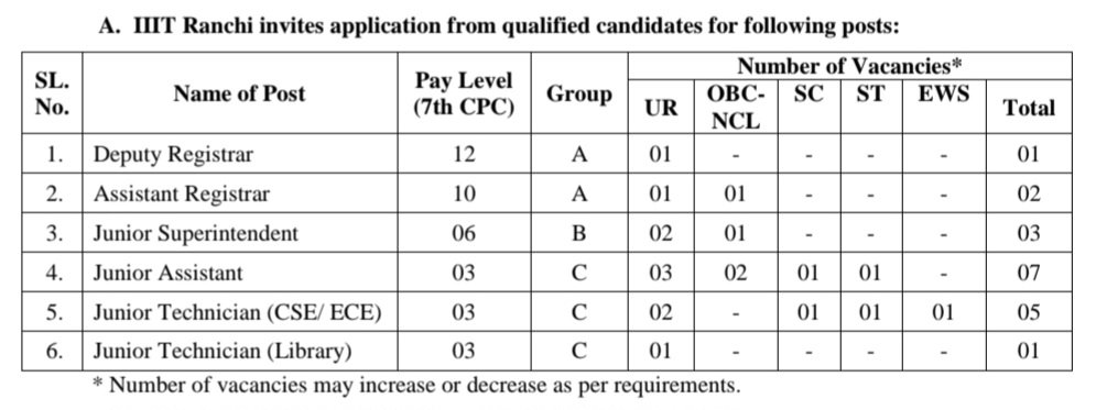 •డిప్యూటీ రిజిస్ట్రార్, అసిస్టెంట్ రిజిస్ట్రార్, జూనియర్ అసిస్టెంట్, జూనియర్ టెక్నీషియన్ (CSE/ECE), జూనియర్ సూపరింటెండెంట్ & జూనియర్ టెక్నీషియన్ (లైబ్రరీ) ఉద్యోగాలు భర్తీ చేస్తున్నారు. మొత్తం ఉద్యోగాలు 19 ఖాళీలు ఉన్నాయి.