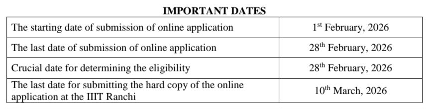 »ఎలా దరఖాస్తు చేయాలి : అభ్యర్థులు సమర్థ్ పోర్టల్ (https://iiitranchint.samarth.edu.in) లో ఆన్లైన్ ప్రక్రియ ద్వారా దరఖాస్తు చేసుకోవాలి. ఆన్లైన్ దరఖాస్తుకు అన్ని అసలు విద్యా మరియు అనుభవ ధృవపత్రాల స్కాన్ చేసిన కాపీలను అప్లోడ్ చేయడం ద్వారా మద్దతు ఇవ్వాలి, లేకుంటే దరఖాస్తు పరిగణించబడదు. ఆన్లైన్ దరఖాస్తు సమర్పణకు చివరి తేదీ ఫిబ్రవరి 28, 2026 రాత్రి 11:59 గంటల వరకు. ఆన్లైన్ దరఖాస్తు సమర్పణకు సంబంధించిన ఏవైనా ఇబ్బందులు ఉంటే recruitment@iiitranchi.ac.in కు పంపవచ్చు.