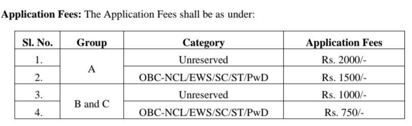 »దరఖాస్తు రుసుము :: అభ్యర్థులు Group బి మరియు పోస్టుకు Unreserved Rs. 1000/-, సి ఓబీసీ-ఎన్సీఎల్/ఈడబ్ల్యూఎస్/ఎస్సీ/ఎస్టీ/పీడబ్ల్యూడీ రూ. 750/- అప్లికేషన్ ఫీ ఉటుంది. Group A పోస్టుకు Unreserved Rs. 2000/ & OBC-NCL/EWS/SC/ST/PwD Rs. 1500/ అప్లికేషన్ ఫీజు చెల్లించే వలసి ఉంటుంది.