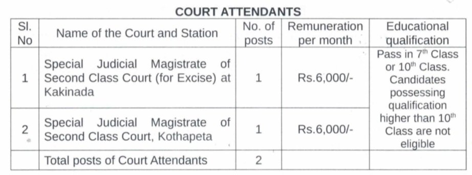 •కోర్టు అటెండెంట్ :: 7వ తరగతి లేదా 10వ తరగతిలో ఉత్తీర్ణత. 10వ తరగతి కంటే ఎక్కువ అర్హత ఉన్న అభ్యర్థులు అర్హులు కాదు.