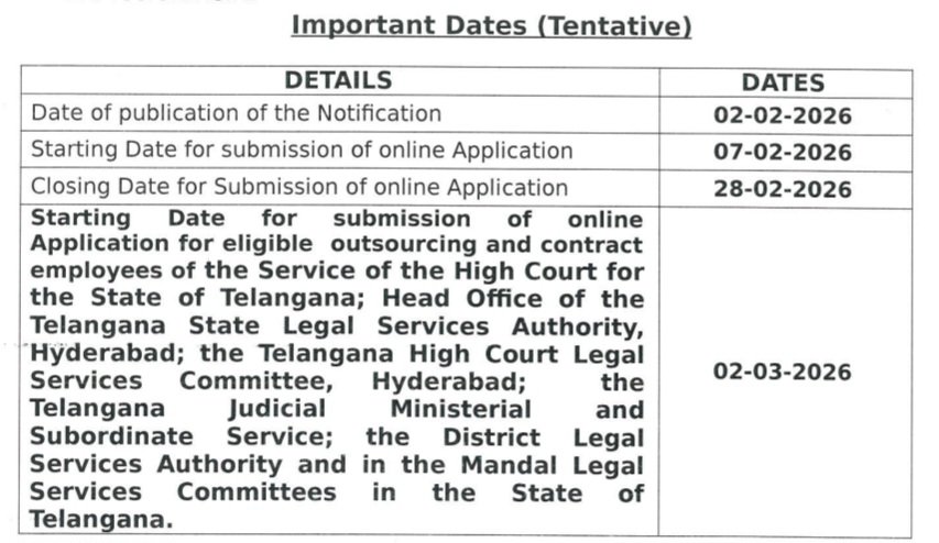 »ఎలా దరఖాస్తు చేయాలి :  ఆన్‌లైన్ అప్లికేషన్ పోర్టల్ హైకోర్టు వెబ్‌సైట్ “https://tshc.gov.in”లో మరియు తెలంగాణ రాష్ట్రంలోని అన్ని జిల్లా కోర్టుల వెబ్‌సైట్‌లలో 07.02.2026 నుండి 28.02.2026 వరకు అందుబాటులో ఉంటుంది. ఆన్‌లైన్ ద్వారా దరఖాస్తు సమర్పించడానికి చివరి తేదీ 28.02.2026 రాత్రి 11.59 గంటల వరకు. ఇతర ఏ విధమైన దరఖాస్తు విధానం అనుమతించబడదు.
