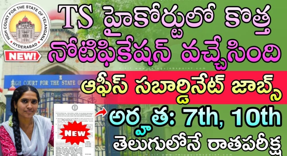 తెలంగాణ రాష్ట్ర హైకోర్టు సేవలో సబార్డినేట్ కార్యాలయ పోస్టులకు ప్రత్యక్ష నియామకం కోసం నోటిఫికేషన్. ఆన్‌లైన్ అప్లికేషన్ పోర్టల్ హైకోర్టు వెబ్‌సైట్ “https://tshc.gov.in”లో మరియు తెలంగాణ రాష్ట్రంలోని అన్ని జిల్లా కోర్టుల వెబ్‌సైట్‌లలో 07.02.2026 నుండి 28.02.2026 వరకు అందుబాటులో ఉంటుంది.  ఈ ఉద్యోగులకు 7th లేదా టెన్త్ పాస్ అయిన అభ్యర్థులు అప్లై చేసుకోవచ్చు. నెల జీతం రూ.19,000/- to రూ.58,850/- మధ్యలో ఇస్తారు. అప్లై చేసుకుంటే సొంత జిల్లాలో ఉద్యోగం వస్తుంది. 01-7-2026 నాటికి, అభ్యర్థికి 18 సంవత్సరాలు నిండి ఉండాలి మరియు 46 సంవత్సరాలు నిండకూడదు. మొత్తం పోస్టులు 34 ఉన్నాయి. ఆన్‌లైన్ ద్వారా దరఖాస్తు సమర్పించడానికి చివరి తేదీ 28.02.2026 రాత్రి 11.59 గంటల వరకు. ఇతర ఏ విధమైన దరఖాస్తు విధానం అనుమతించబడదు. వివరణాత్మక పరీక్ష షెడ్యూల్ హైకోర్టు వెబ్‌సైట్ https://tshc.gov.in లో ఉంచబడుతుంది. దరఖాస్తుదారులు నియామకం పూర్తయ్యే వరకు అన్ని దశలు/ఫలితాల గురించి తాజాగా ఉండటానికి తెలంగాణ రాష్ట్ర హైకోర్టు అధికారిక వెబ్‌సైట్‌ను సందర్శించాలి.