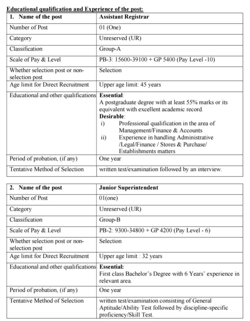 అసిస్టెంట్ రిజిస్ట్రార్ :: కనీసం 55% మార్కులతో పోస్ట్ గ్రాడ్యుయేట్ డిగ్రీ లేదా అద్భుతమైన విద్యా రికార్డుతో సమానమైనది. కోరదగినది. నిర్వహణ/ఫైనాన్స్ & అకౌంట్స్ రంగంలో వృత్తిపరమైన అర్హత. అడ్మినిస్ట్రేటివ్ / లీగల్ /ఫైనాన్స్ /స్టోర్స్ & కొనుగోలు /ఎస్టాబ్లిష్మెంట్ విషయాలను నిర్వహించడంలో అనుభవం.