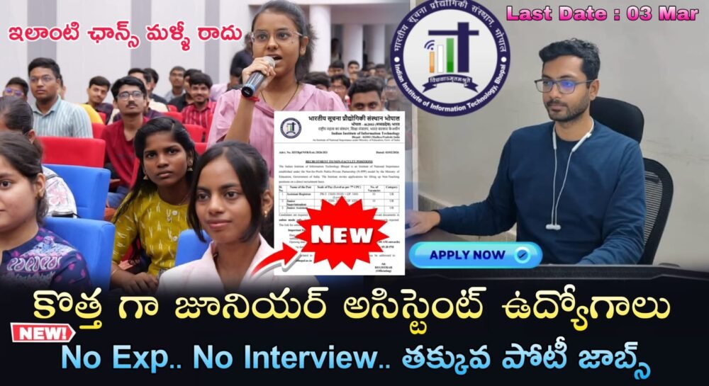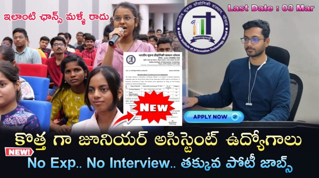 Latest IIIT Bhopal Recruitment 2026 Latest Junior Assistant Jobs Notification 2026 Apply Now : ప్రెండ్స్ ఈరోజు మీకోసం ఒక భారీ గవర్నమెంట్ జాబ్ నోటిఫికషన్లు మీ ముందుకు తీసుకురావడం జరిగింది మీరు Any డిగ్రీ పాస్ అయివుంటే… ఇండియన్ ఇన్స్టిట్యూట్ ఆఫ్ ఇన్ఫర్మేషన్ టెక్నాలజీ (IIIT) భోపాల్ లో భారత ప్రభుత్వ విద్యా మంత్రిత్వ శాఖ ద్వారా అసిస్టెంట్ రిజిస్ట్రార్, జూనియర్ సూపరింటెండెంట్ & జూనియర్ అసిస్టెంట్ బోధనేతర పోస్టుల భర్తీకి దరఖాస్తులను ఆహ్వానిస్తుంది. దరఖాస్తు ఫారమ్ ఆన్‌లైన్ సమర్పణకు చివరి తేదీ 03-03-2026, సాయంత్రం 05:30 వరకు ఆన్లైన్ https://iiitbhopal.ac.in/ లో అప్లై చేయండి.