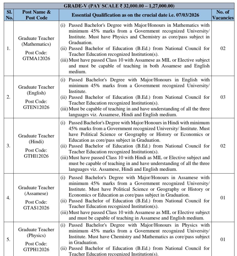 •గ్రాడ్యుయేట్ టీచర్ :: ప్రభుత్వం గుర్తింపు పొందిన విశ్వవిద్యాలయం/సంస్థ నుండి కనీసం 45% మార్కులతో గణితంలో మేజర్/ఆనర్స్తో బ్యాచిలర్ డిగ్రీ ఉత్తీర్ణత. గ్రాడ్యుయేషన్లో ఫిజిక్స్ మరియు కెమిస్ట్రీ కోర్/పాస్ సబ్జెక్టుగా ఉండాలి. నేషనల్ కౌన్సిల్ ఫర్ టీచర్ ఎడ్యుకేషన్ గుర్తింపు పొందిన సంస్థ(లు) నుండి బ్యాచిలర్ ఆఫ్ ఎడ్యుకేషన్ (B.Ed.) ఉత్తీర్ణులై ఉండాలి.