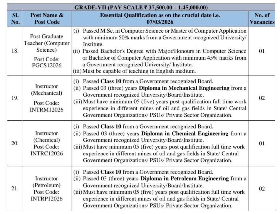 •Instructor :: ప్రభుత్వ గుర్తింపు పొందిన బోర్డు నుండి 10వ తరగతి ఉత్తీర్ణత. ప్రభుత్వం గుర్తింపు పొందిన విశ్వవిద్యాలయం/బోర్డు/సంస్థ నుండి మెకానికల్ ఇంజనీరింగ్లో 03 (మూడు) సంవత్సరాల డిప్లొమా ఉత్తీర్ణత. రాష్ట్ర/కేంద్ర ప్రభుత్వ సంస్థలు/పీఎస్యులు/ప్రైవేట్ రంగ సంస్థల్లోని చమురు మరియు గ్యాస్ క్షేత్రాల వివిధ గనులలో అర్హత తర్వాత కనీసం 05 (ఐదు) సంవత్సరాల పూర్తి సమయం పని అనుభవం ఉండాలి.
