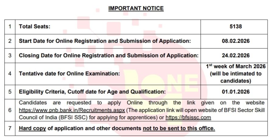 »ఎలా దరఖాస్తు చేయాలి : అప్రెంటిస్షిప్ నోటిఫికేషన్ బ్యాంక్ వెబ్సైట్ (https://pnb.bank.in/Recruitments.aspx) మరియు BFSI SSC వెబ్సైట్ (https://bfsissc.com)లో “ఉపాధి అవకాశాలు >> అప్రెంటిస్షిప్ అవకాశాలు >> పంజాబ్ నేషనల్ బ్యాంక్ >> PNB అప్రెంటిస్షిప్ ప్రోగ్రామ్ 2025-26 >> వివరణాత్మక నోటిఫికేషన్ తేదీ. 06.02.2026” అనే విభాగంలో అందుబాటులో ఉంటుంది.