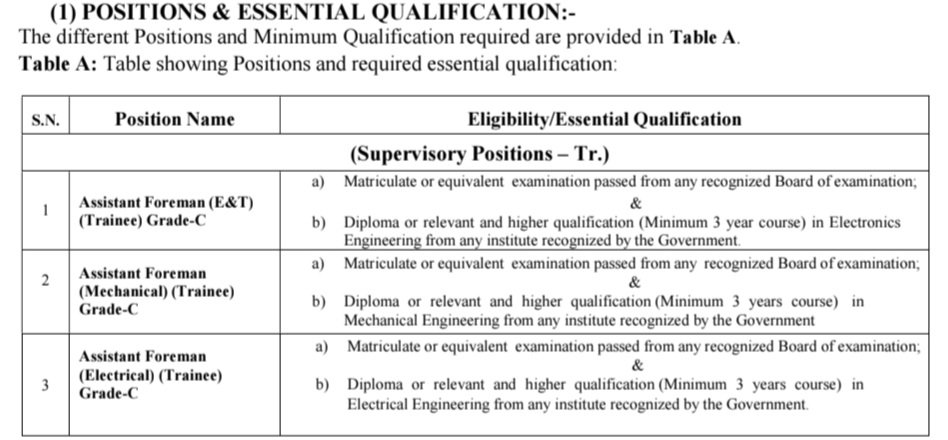 అసిస్టెంట్ ఫోర్‌మెన్ (మెకానికల్) (ట్రైనీ) గ్రేడ్-సి :: ఏదైనా గుర్తింపు పొందిన పరీక్షా బోర్డు నుండి మెట్రిక్యులేషన్ లేదా తత్సమాన పరీక్షలో ఉత్తీర్ణత, ప్రభుత్వం గుర్తింపు పొందిన ఏదైనా సంస్థ నుండి మెకానికల్ ఇంజనీరింగ్‌లో డిప్లొమా లేదా సంబంధిత మరియు అంతకంటే ఎక్కువ అర్హత (కనీసం 3 సంవత్సరాల కోర్సు).