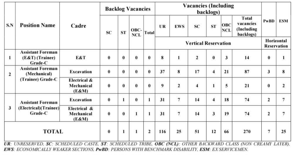 పోస్ట్ వివరాలు : అసిస్టెంట్ ఫోర్‌మెన్ (ఇ & టి) (ట్రైనీ) గ్రేడ్-సి, అసిస్టెంట్ ఫోర్‌మెన్ (మెకానికల్) (ట్రైనీ) గ్రేడ్-సి & అసిస్టెంట్ ఫోర్‌మెన్ (ఎలక్ట్రికల్) (ట్రైనీ) గ్రేడ్-సి తదితర 270 ఉద్యోగాలు ఉన్నాయి.