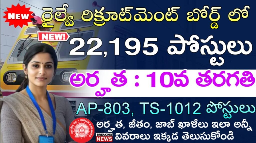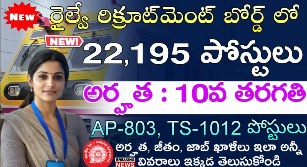 RRB Group D Notification 2026 Andhra Pradesh and Telangana vacancy eligibility all details in Telugu : రైల్వే రిక్రూమెంట్ బోర్డ్ (RRB)లో 22,195 లెవెల్ 1 గ్రూప్ డి ఉద్యోగుల కోసం నోటిఫికేషన్ విడుదల చేశారు. తెలుగు రాష్ట్రాలలో విశాఖ డివిజన్లో 803 ఉద్యోగాలు & హైదరాబాద్ జోన్లో 1012 ఉద్యోగాలు ఉన్నాయి. ఈ ఉద్యోగులకు కేవలం 10వ తరగతి పాస్ అయిన అభ్యర్థులు అప్లై చేసుకోవచ్చు. రూ.₹18,000/- to ₹56,900/- మధ్యలో నెల జీతం ఇస్తారు. అప్లై చేసుకుంటే సొంత రాష్ట్రంలోనే సొంత జిల్లాలోని రాతపరీక్ష ఉంటుంది. అప్లై కేవలం https://www.rrbapply.gov.in/ ఆన్లైన్లో చేసుకోవాలి.