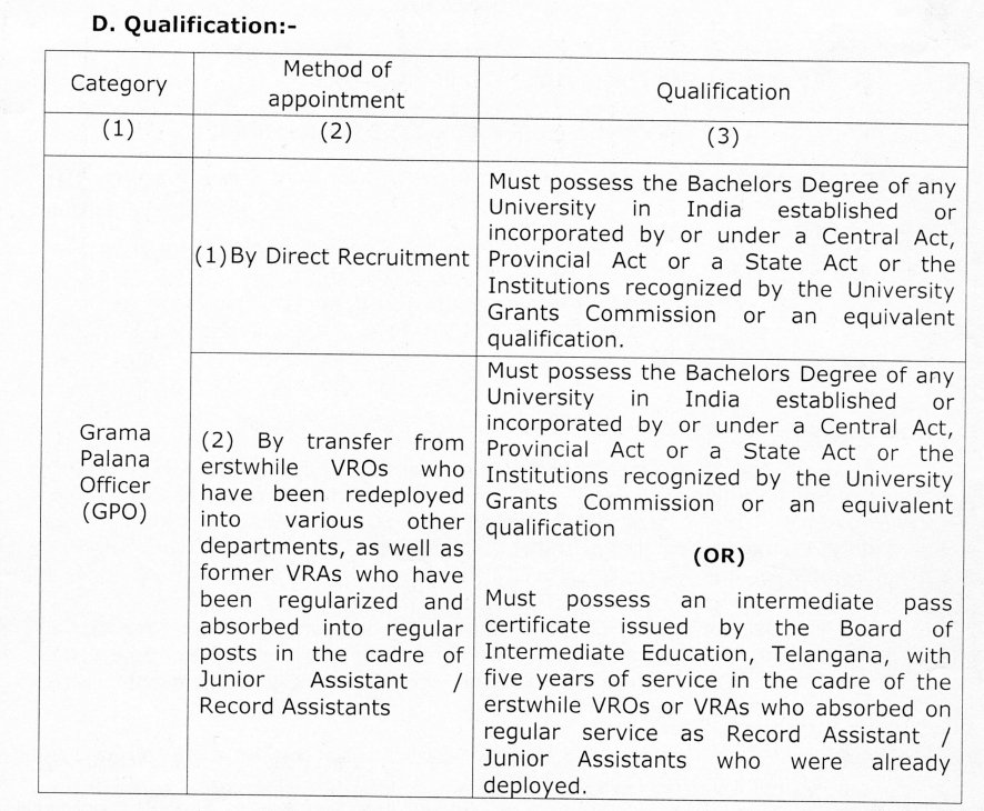 వివిధ విభాగాల్లోకి తిరిగి నియమించబడిన మాజీ VRAల నుండి బదిలీ ద్వారా, అలాగే జూనియర్ అసిస్టెంట్ / రికార్డ్ అసిస్టెంట్ల కేడర్‌లో రెగ్యులరైజ్ చేయబడి రెగ్యులర్ పోస్టుల్లోకి చేర్చబడిన మాజీ VRAల నుండి విద్యా అర్హత భారతదేశంలోని ఏదైనా విశ్వవిద్యాలయం నుండి కేంద్ర చట్టం, ప్రాంతీయ చట్టం లేదా రాష్ట్ర చట్టం లేదా విశ్వవిద్యాలయ గ్రాంట్స్ కమిషన్ గుర్తించిన సంస్థల ద్వారా స్థాపించబడిన లేదా విలీనం చేయబడిన బ్యాచిలర్ డిగ్రీని కలిగి ఉండాలి లేదా దానికి సమానమైన అర్హతను కలిగి ఉండాలి. (OR) తెలంగాణ ఇంటర్మీడియట్ విద్యా మండలి జారీ చేసిన ఇంటర్మీడియట్ పాస్ సర్టిఫికేట్ కలిగి ఉండాలి, గతంలో VROS లేదా VRA లుగా పనిచేసిన రికార్డ్ అసిస్టెంట్ / జూనియర్ అసిస్టెంట్లుగా రెగ్యులర్ సర్వీసులో చేరిన వారి కేడర్‌లో ఐదు సంవత్సరాల సర్వీస్ కలిగి ఉండాలి.