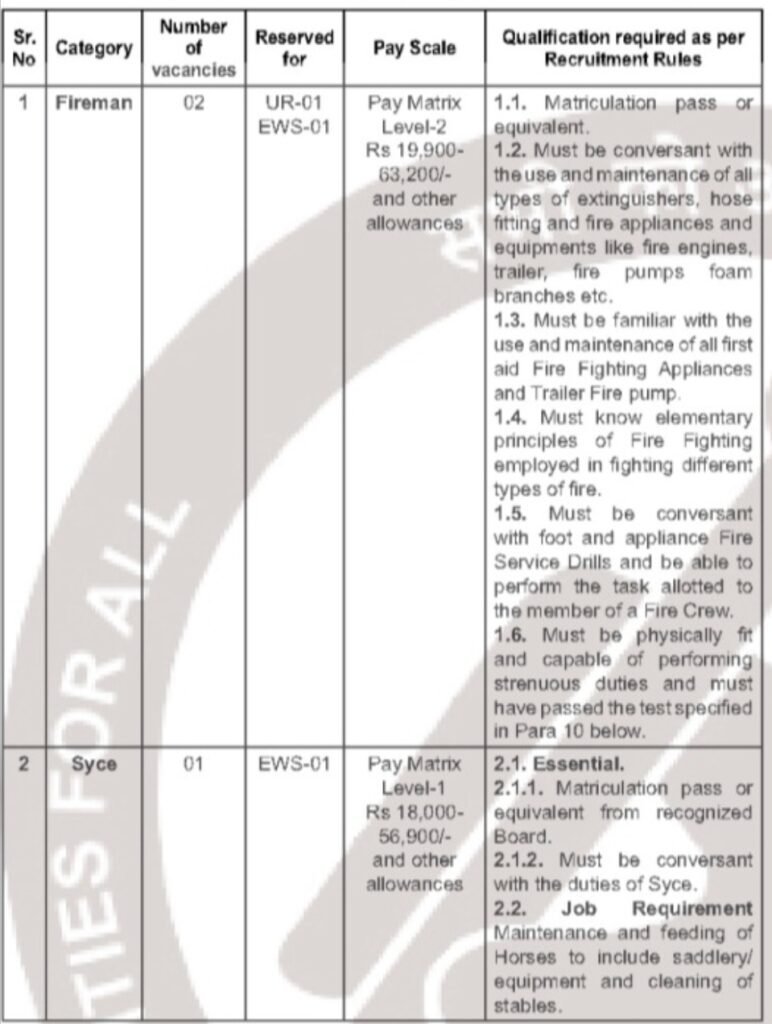 •Fireman & Syce ఉద్యోగాలు భర్తీ చేస్తున్నారు. మొత్తం ఉద్యోగాలు 03 ఖాళీలు ఉన్నాయి.